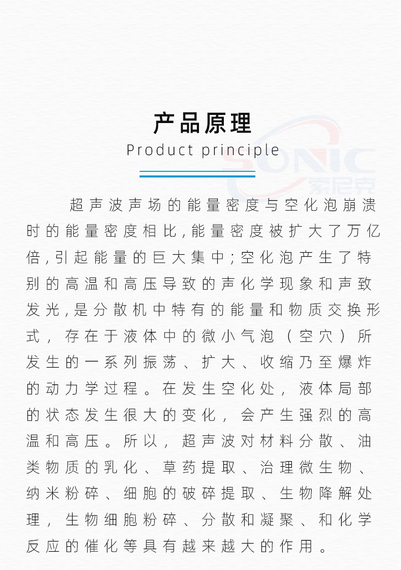 超声波分散在很多领域都有广泛的应用:如食品、化妆品、医药、化学、涂料、石墨烯等。超声波在食品分散中的应用大体可以分为:液-液系分散(乳剂)、固-液系分散(悬浮体)、气-液系分散三种情况。