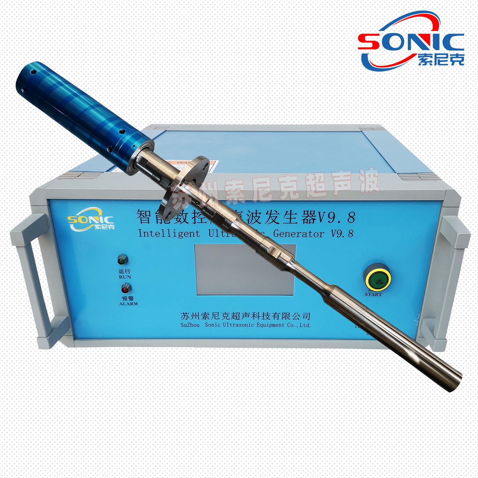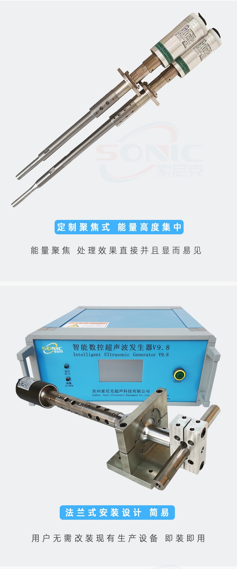 大功率超声波金属熔体处理系统由超声波振动部件和超声波专用驱动电源两部分构成:超声波振动部件主要包括大功率超声波换能器、变幅杆、工具头(发射头),用于产生超声波振动,并将此振动能量向金属熔体中发射。