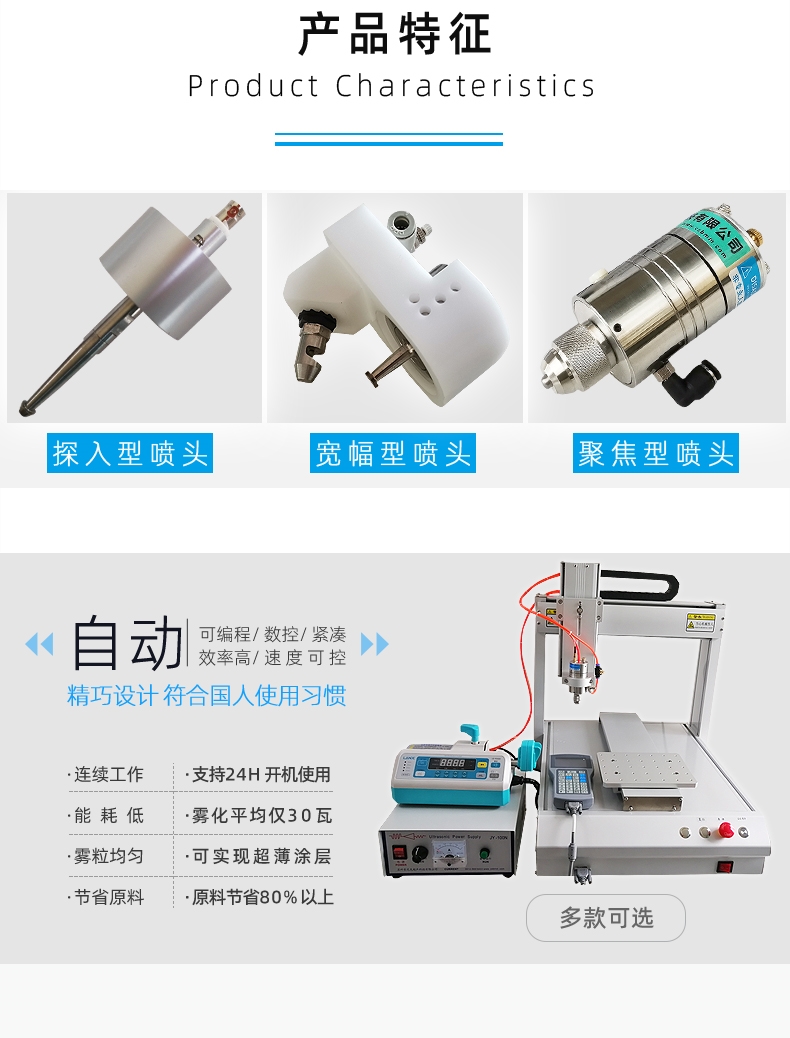 通过超声波雾化喷涂设备将需要制作的薄膜溶剂通过超声波雾化喷涂设备液体通道传送至雾化头,由超声波作用,高频振荡分散至微米甚至纳米级别的微粒,在通过加气来控制喷涂的范围,这样薄膜溶剂就能够均匀并且有形状的附着于玻璃基材,这样制备的薄膜不仅和玻璃贴合度高,且成像效果相比普通坚膜方式制备的显示器图像更为清晰。