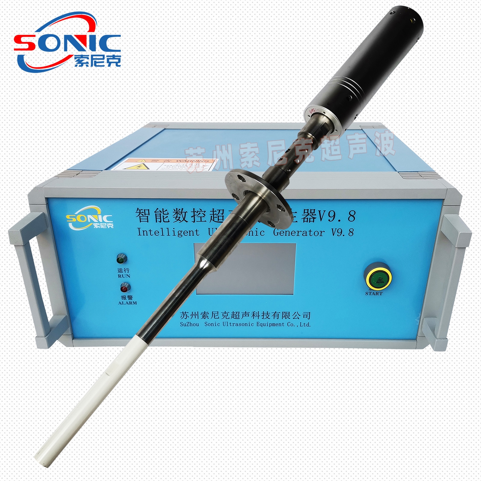 大功率超声波金属熔体处理系统由超声波振动部件和超声波专用驱动电源两部分构成:超声波振动部件主要包括大功率超声波换能器、变幅杆、工具头(发射头),用于产生超声波振动,并将此振动能量向金属熔体中发射。